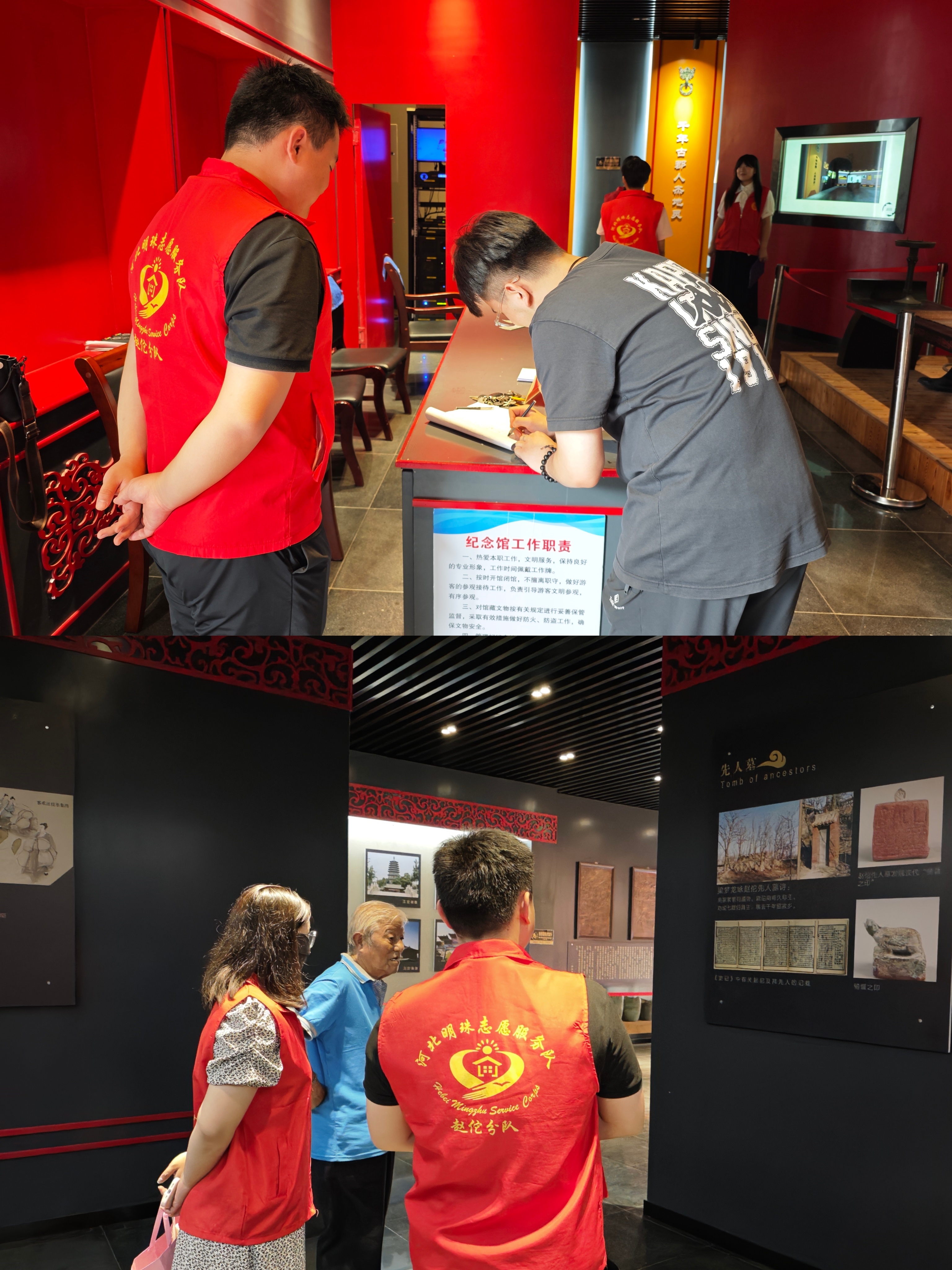 在纪念馆中,志愿服务站任队长首先向志愿者们介绍了服务职责与注意事项,并带领大家参观展陈,讲解赵佗的生平事迹,阐释其在促进民族团结、推动中原文化传播方面的重要作用。志愿者们认真聆听讲解、学习历史,从赵佗创立南越国,到“和辑百越”、推广中原文化、促进民族融合,他的人生轨迹成为志愿者们了解中华传统文化与地域历史的重要窗口。学习之后,志愿者们正式投入到服务环节:有人担任公益讲解员,向游客介绍展览内容,传播家乡文化;有人维持现场秩序,引导游客文明参观;有人负责答疑解惑,耐心回应游客的问题;最后,全体志愿者还对馆区进行了清洁整理。一系列具体而扎实的服务,展现了青年志愿者的服务热情与专业素养。