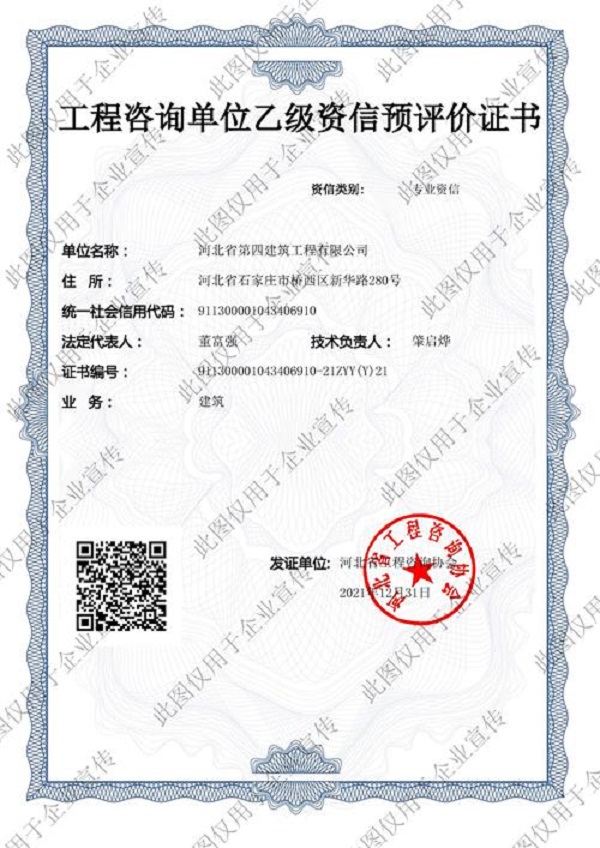 1月6日,河北四建喜获“工程咨询单位(建筑)乙级资信预评价证书”。河北四建将可在本专业内承揽建设项目的工程咨询业务,新业务的注入为河北四建带来新的活力,标志着河北四建在工程咨询服务领域迎来广阔的发展空间。