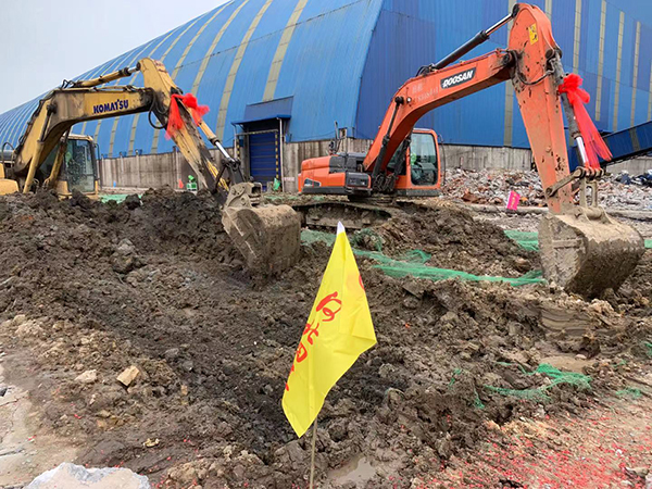 5月2日和3日连续降雨,打桩后产生的淤泥经大雨冲刷散布现场各处,雨后项目全体人员开始清淤工作,因环保要求白天不宜外运出场,管理人员便夜间加班“作战”,争分夺秒为后续工作创造工作面。白天平整场地、夜间倒运淤泥,经过项目全体人员的连日奋战,使项目具备了开工条件。
